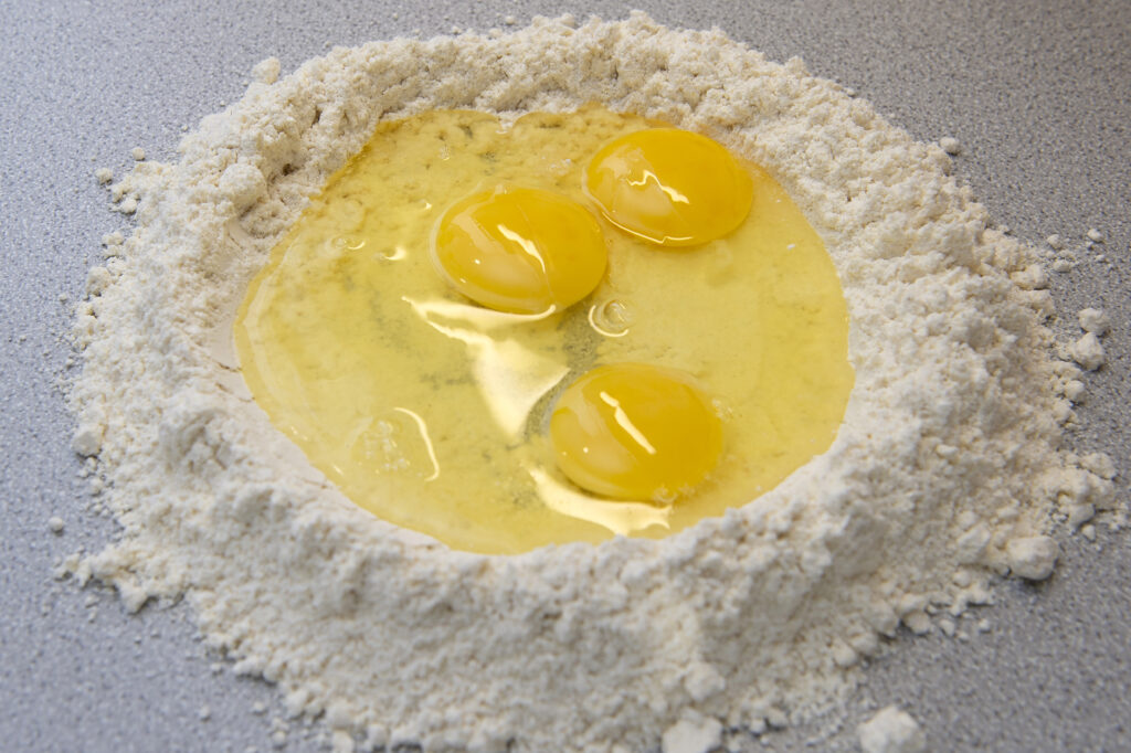 Sekoita jauhot ja ksantaanikumi keskenään. Kumoa jauhot pöydälle, tee keskelle ”kulho” ja riko kananmunat siihen. Sekoittele kananmunia varovasti haarukalla niin, että jauho reunoilta tulee hiljalleen mukaan. Kun taikina alkaa muodostua tahmeaksi, voit painella ja pyöritellä sitä esimerkiksi leivinlastalla, kunnes kaikki jauho on mukana. Vaivaa taikinaa, kunnes se muuttuu kiinteämmäksi eikä ole enää niin tahmea. Ripottele tarvittaessa päälle lisää jauhoja.