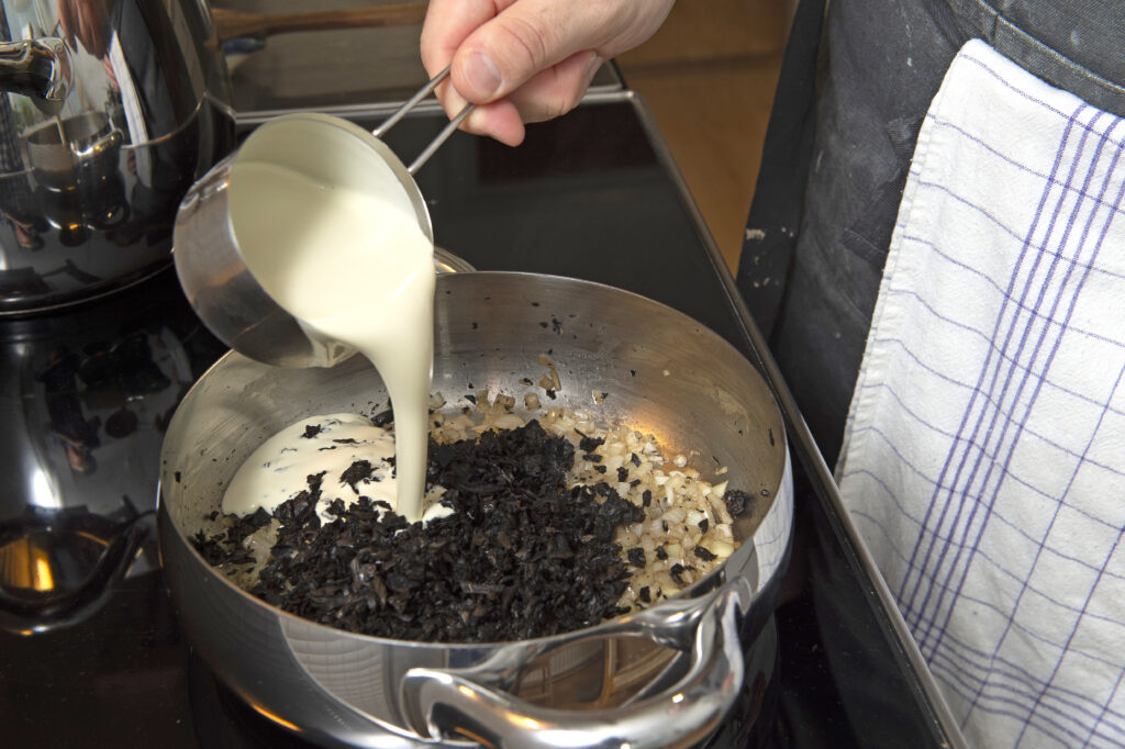 Hienonna peratut mustatorvisienet pieneksi silpuksi. Paahda niitä keskikovalla paistolämmöllä kuivalla pannulla, kunnes neste on haihtunut. Siirrä paahdetut sienet lautaselle odottamaan.