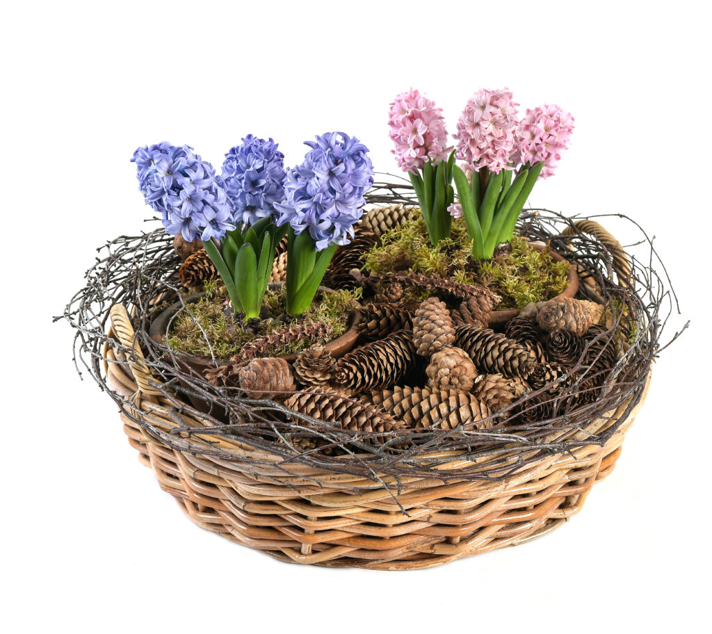 Hyasinttikori on helppo päivittää juhlapäivästä toiseen, kun kukat ovat suojaruukuissa ja vaihdettavissa ilman multaa tai muovivuorausta. Koriin piilotetut ruukut katoavat sammaleen ja käpyjen alle, ja vanhakin kori saa uuden ilmeen, kun sen ympärille kieputtaa koivunrisuista tehdyn kranssin. Asetelman voi rakentaa myös laakeaan vatiin tai puulaatikkoon, ja kukkia voi vaihtaa kauden mukaan: itsenäisyyspäivän sinisistä ja sinivalkoisista hyasinteista aina jouluisiin sävyihin tai muihin talven kasveihin, kuten jouluruusuun, sypressiin, joulutähteen tai atsaleaan. Näin koko asetelma säilyy elävänä ja kauniina pitkälle talveen.