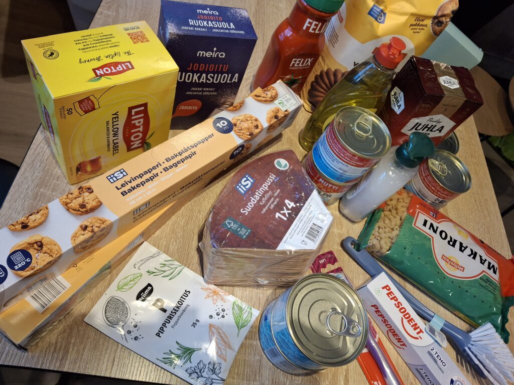 Paketista löytyy hammasharjoja ja -tahnaa, saippuaa ja ihovoidetta sekä muita hygieniatuotteita. Naisille on siteitä ja vauvoille vaippoja. Paketissa on lisäksi moppi, lakaisusetti ja WC-harja. Pesuaineet löytyvät niin keittiöön kuin koko huushollin puhtaanapitoon. Astianpesuaine, tiskiharja ja pöytärätit ovat olennainen osa pakettia.