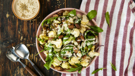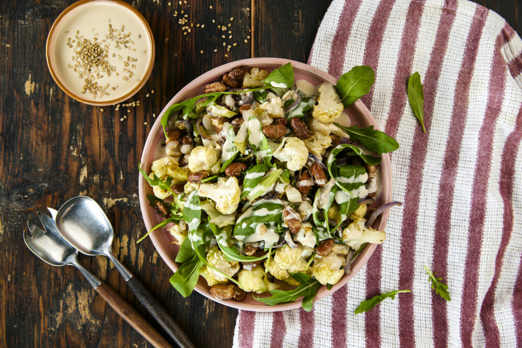 Kukkakaali-papusalaatti ja tahinikastike.