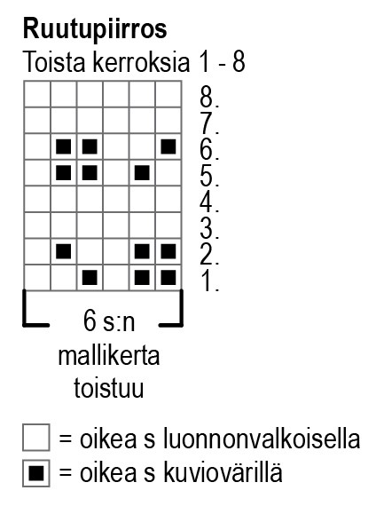 Aloita kirjoneule ruutupiirroksen 1. kerrokselta ja toista 6 s:n mallikerta 7(8) kertaa.