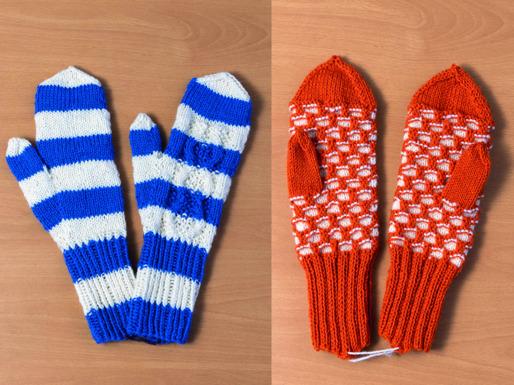 – Nämä sinivalkoiset marttojen ohjeella neulotut tumput laitan talkoisiin ja nämä oranssit, lämpimät kennolapaset vielä kisaankin tyrkylle, Tuija suunnittelee.