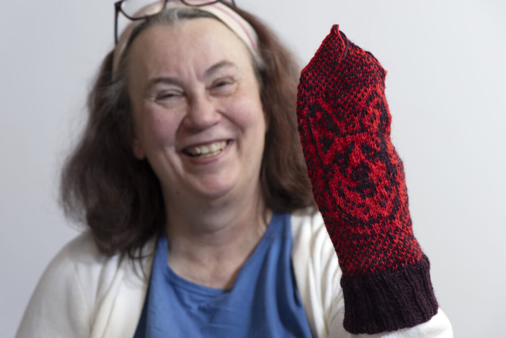 – Tosin nämä kesken olevat lapasetkin ovat kyllä hienot, näissä on Jonna Kapelan suunnittelema corgi-koiran kasvokuva.