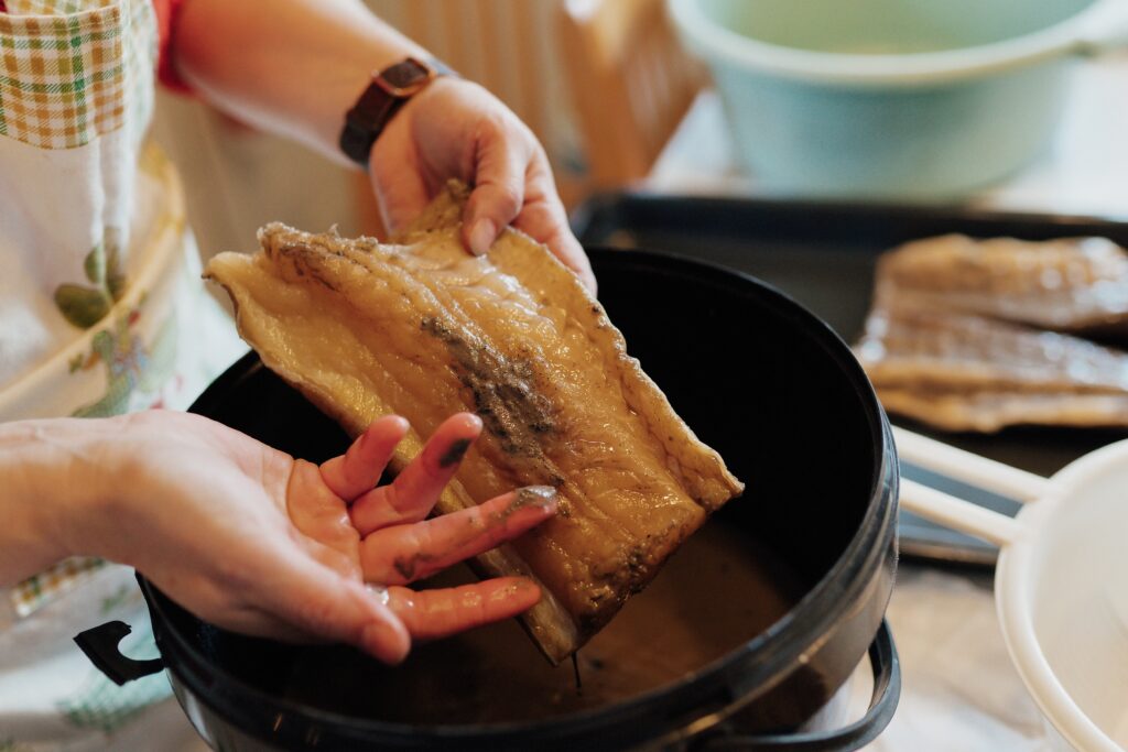Käytän lipeäkalan valmistamiseen kapakalaa eli kuivattua turskaa tai molvaa riippuen siitä, mitä kauppahallista milloinkin saa. Leikkaan kalan kunnon puutarhasaksilla kolmeen osaan ja laitan ne ämpäriin laimennetun lipeän kanssa. Vien ämpärin sen jälkeen viileään varastoon viikoksi.