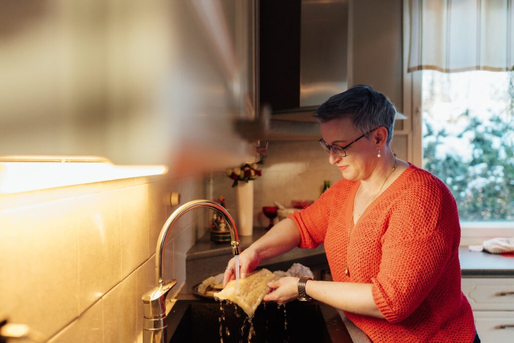 Huuhtelen kalaa alkuun noin kolme kertaa päivässä ja pesen sen pintaa varovasti pehmeällä harjalla. Samalla vaihdan ämpäriin puhtaan veden. Lopuksi valutan, painelen ja kuivaan kalasta ylimääräiset vedet.