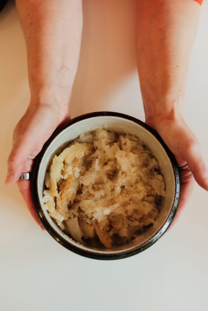 Sitten perkaan kalan erilliseen tarjoiluastiaan. Ruokalusikallinen voita kuuluu omaan reseptiini, samoin kunnon suolaus. Kalasta tulee pientä silppua, sillä se on tässä vaiheessa jo pehmeää, mutta napakkaa – limaisuudesta ei ole tietoakaan.