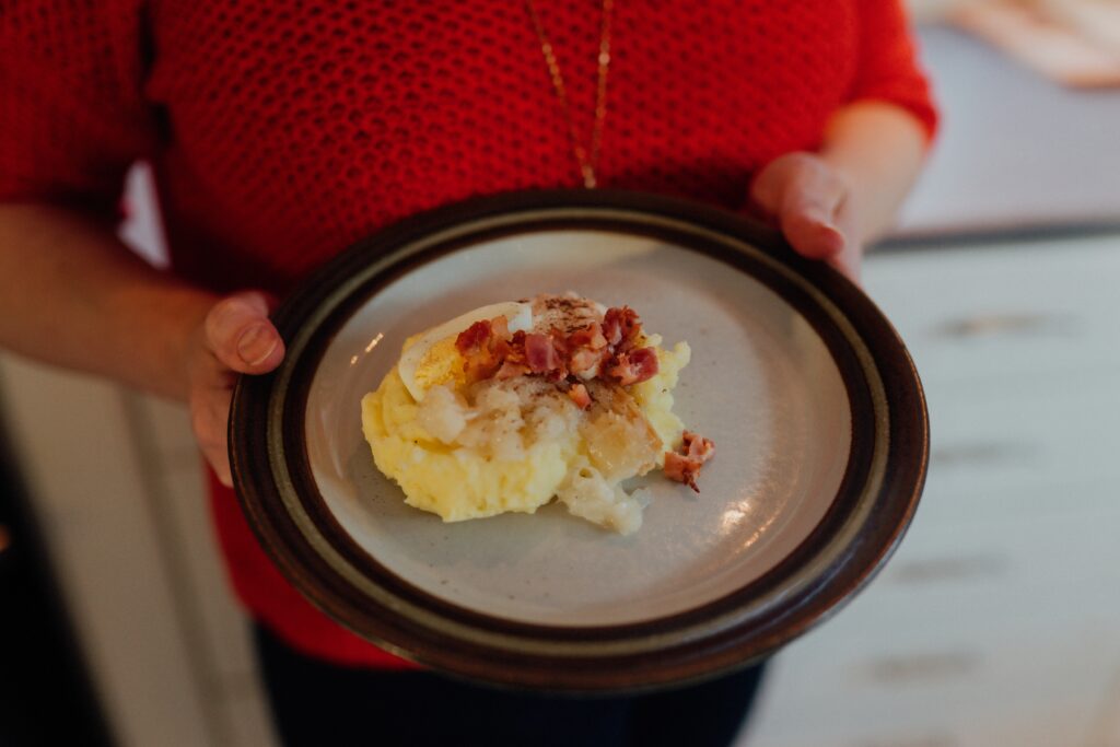 Tarjoilen lipeäkalan keitettyjen ja murskattujen puikulapottujen kanssa. Päälle kaadan ihan tavallista valkoista kastiketta, johon olen keittänyt ja pilkkonut sekaan kananmunaa. Lisäksi jauhettu maustepippuri tuo oikean säväyksen.