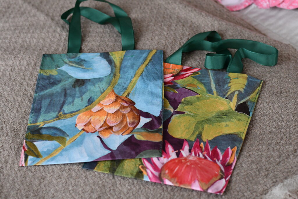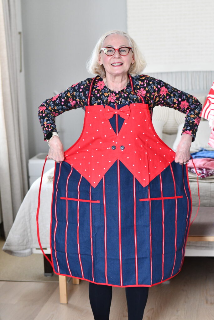 – Sain viime vuonna muutamalta yhdistyksemme martalta kaksi kassillista Finlaysonin ja Tampellan kankaita. Heidän vanhempansa olivat olleet Tampereen-tehtaalla töissä, ja nämä kankaat olivat jäännöspaloja, jotka olisivat muuten joutuneet roskikseen. Siistin ja silitin kankaat, ja suunnittelin ja sommittelin niistä miesten ja naisten essuja sekä kasseja myyjäisiin.