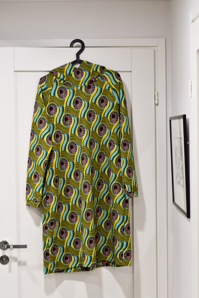 – Kun Venäjä hyökkäsi Ukrainaan, tein solidaarisuutta osoittaakseni hupparin, jossa on Ukrainan lipun värejä. Löysin hupparikankaan vanhasta tamperelaisesta kangaskaupasta, Tekstiili-Fihl-Tuominen-liikkeestä. Siellä on myös tällaisia vanhoja laadukkaita kankaita, joita ei enää myydä missään muualla. Pidän hupuista, jotka lämmittävät niskaa. Myös Ukraina-mekossani on huppu.