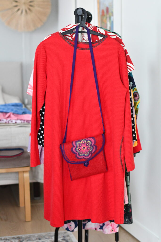 – Siskoni piti aikoinaan kangaskauppaa Ruotsissa, ja sain tämän kankaan häneltä 15 vuotta sitten. Pidän mekkoa jouluaikaan myyjäisissä ja muissa tapahtumissa. Siihen kuuluu myös itse tehdyt legginsit ja tämä pikkulaukku, jonka olen itse huovuttanut. Tein aikoinaan tällaisia pikkulaukkuja koirankakkapussi-laukuiksi jämäkankaista ja huovasta. Ne ovat käteviä, kun lähtee koiran kanssa ulos ja tarvitsee paikan avaimille, puhelimelle ja kakkapusseille.