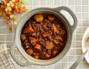 Ihastu lempeän tomaattiseen juures-papupataan