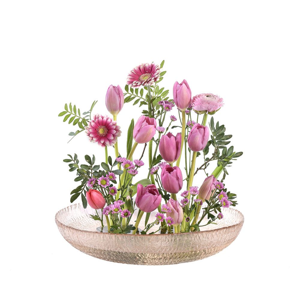Kukkasiilin avulla syntyy nopeasti suloinen asetelma, joka korostaa tulppaanien väriä ja muotoa. Täydennä asetelmaa leikkovihreällä ja muilla kukilla, kuten gerberoilla, jaloleinikeillä tai krysanteemeilla, ja luo oma tyylisi.
