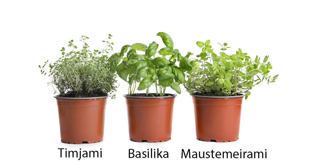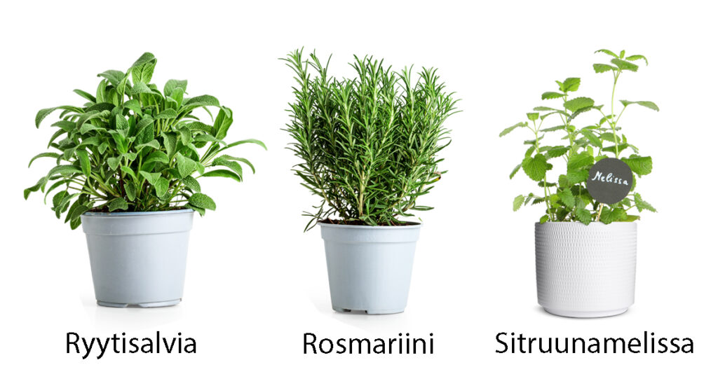 Mintut, mäkimeirami, lipstikka ja ranskalainen rakuuna ovat monivuotisia ja viihtyvät omassa ruukussa. Niiden juurtuneet taimet voi istuttaa myös ulos.