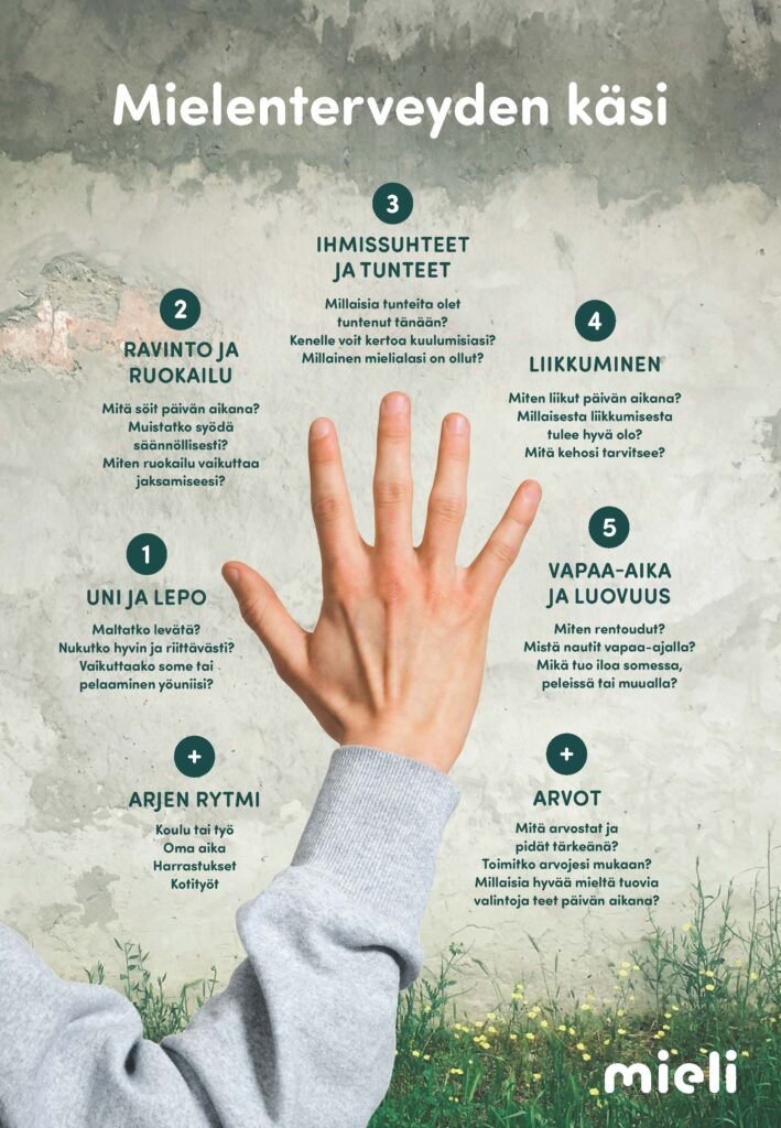 Mielenterveyden käsi havainnollistaa arjen hyvinvoinnin eri osa-alueita. Kuten käsi tarvitsee kaikkia sormia toimiakseen, myös mielenterveyttä ylläpidetään huolehtimalla hyvinvoinnin eri osatekijöistä.